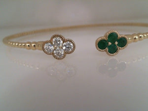 Sabrina 14k yellow gold flexible diamond and emerald clover open bangl